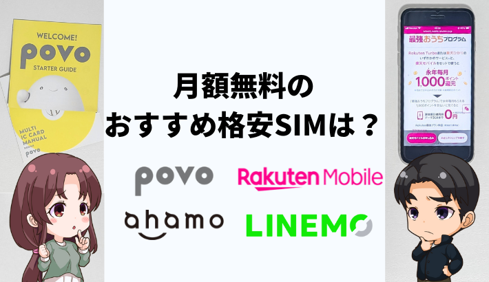 完全無料の0円SIMはありませんが、povoなら基本料金0円、楽天モバイルなら実質無料で利用できます。