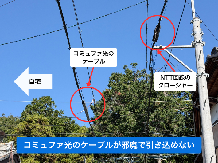 工事ができなかった原因は、NTT回線のクロージャー(黒い箱)と自宅の間にコミュファ光のケーブルが通っており、干渉してしまうためこのままでは工事ができないとのことでした。