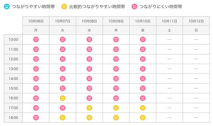 問い合わせページにサポート窓口の混雑状況が載っていますが、ほとんど「つながりにくい時間帯」となっており、17〜18時台のみ「比較的つながりやすい時間帯」となっています。