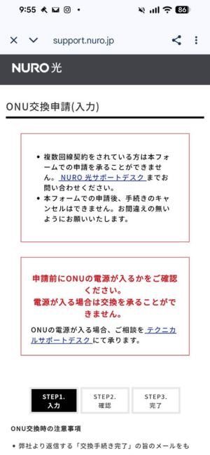 NURO光公式サイトの「ONU交換申請フォーム」を開き、契約者情報・設置住所・機器の型番・症状などを入力します。
